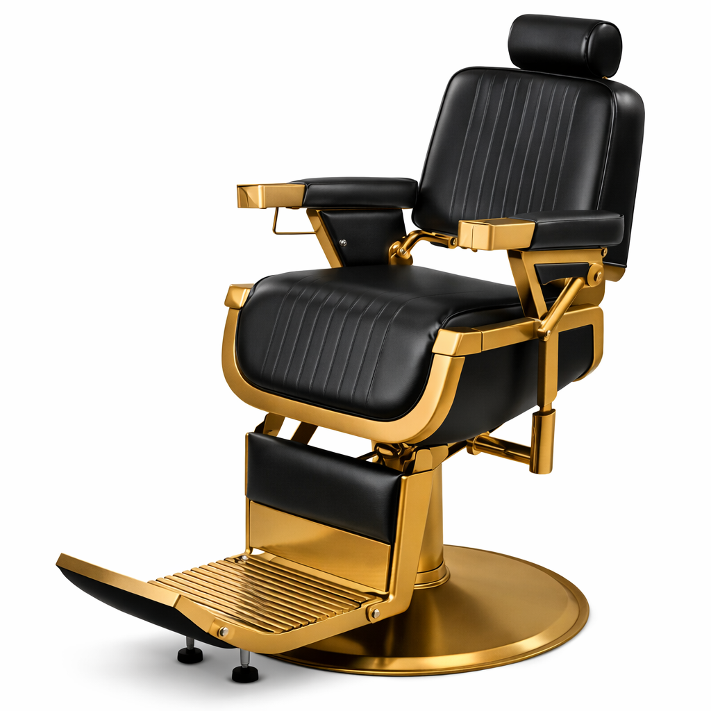 Bierut Barber Chair Gold is a spacious, plush, heavy duty and durable black reclining chair. Take special note of the extra wide 22″ dimensions between the arms, unlike our competitors whose chairs span a total of 19″. This solidly-built classic chair is comfortable and roomy and seats anyone perfectly. This barber chair is truly a classic and popular with traditional barbers. The reclining barber chair features sturdy construction, round chrome base, heavy duty round hydraulic pump and an adjustable/removable headrest. The footrest rises as chair is reclined, and the reclining lever on the right hand of the chair allows the chair to recline up to 45 degrees.