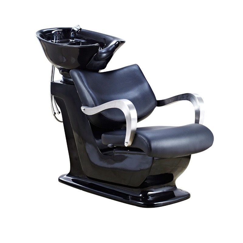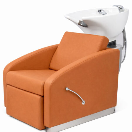 Upscale black shampoo chair with upholstered and high quality black vinyl. European Square design . Adjustable tilting porcelain bowl and adjustable seat. Includes chrome faucet, spray & hose and drain assembly. Available in fibreglass base.Base Color: Black . Dimensions: 41″L x 22″W x 38″H